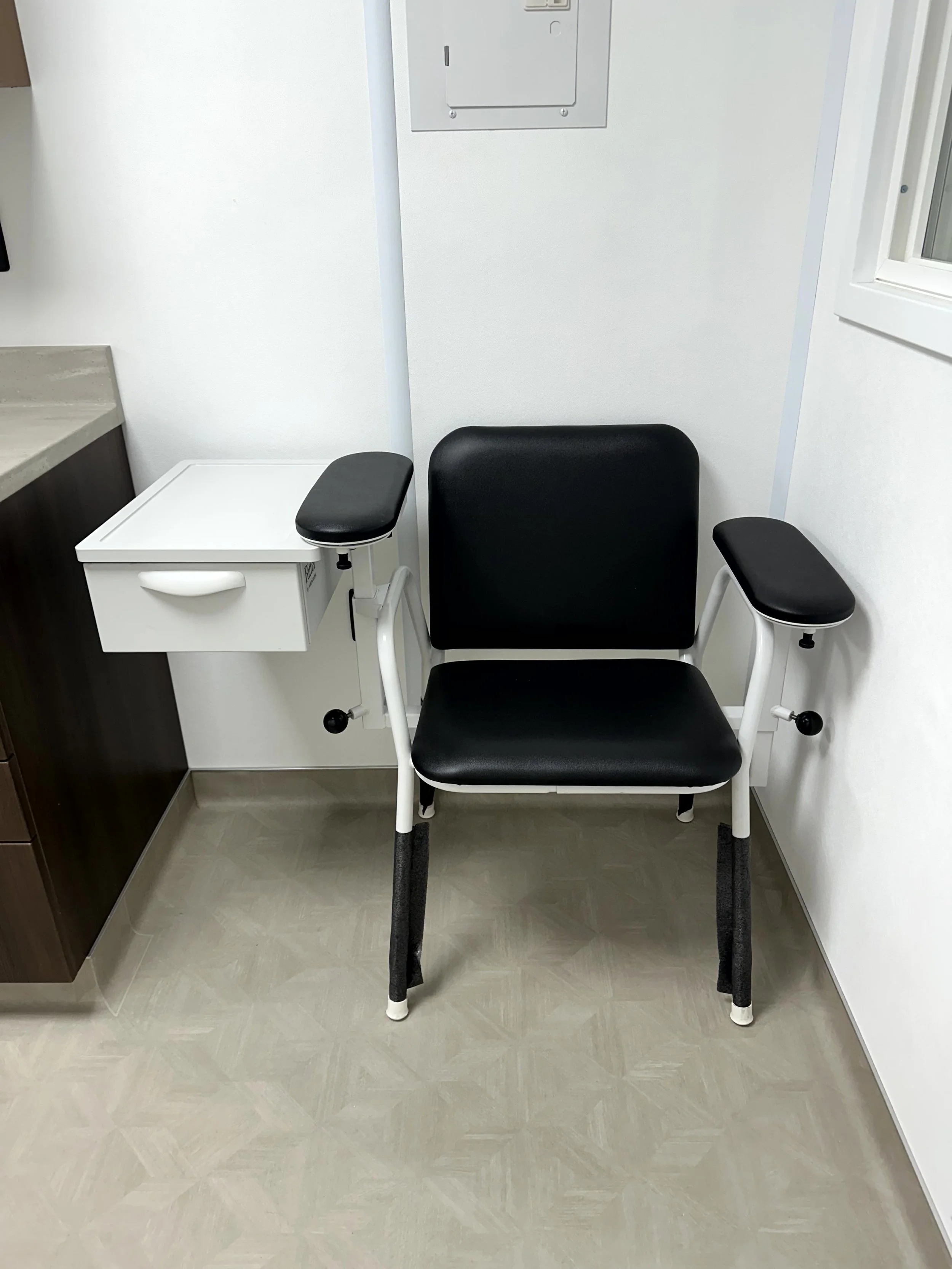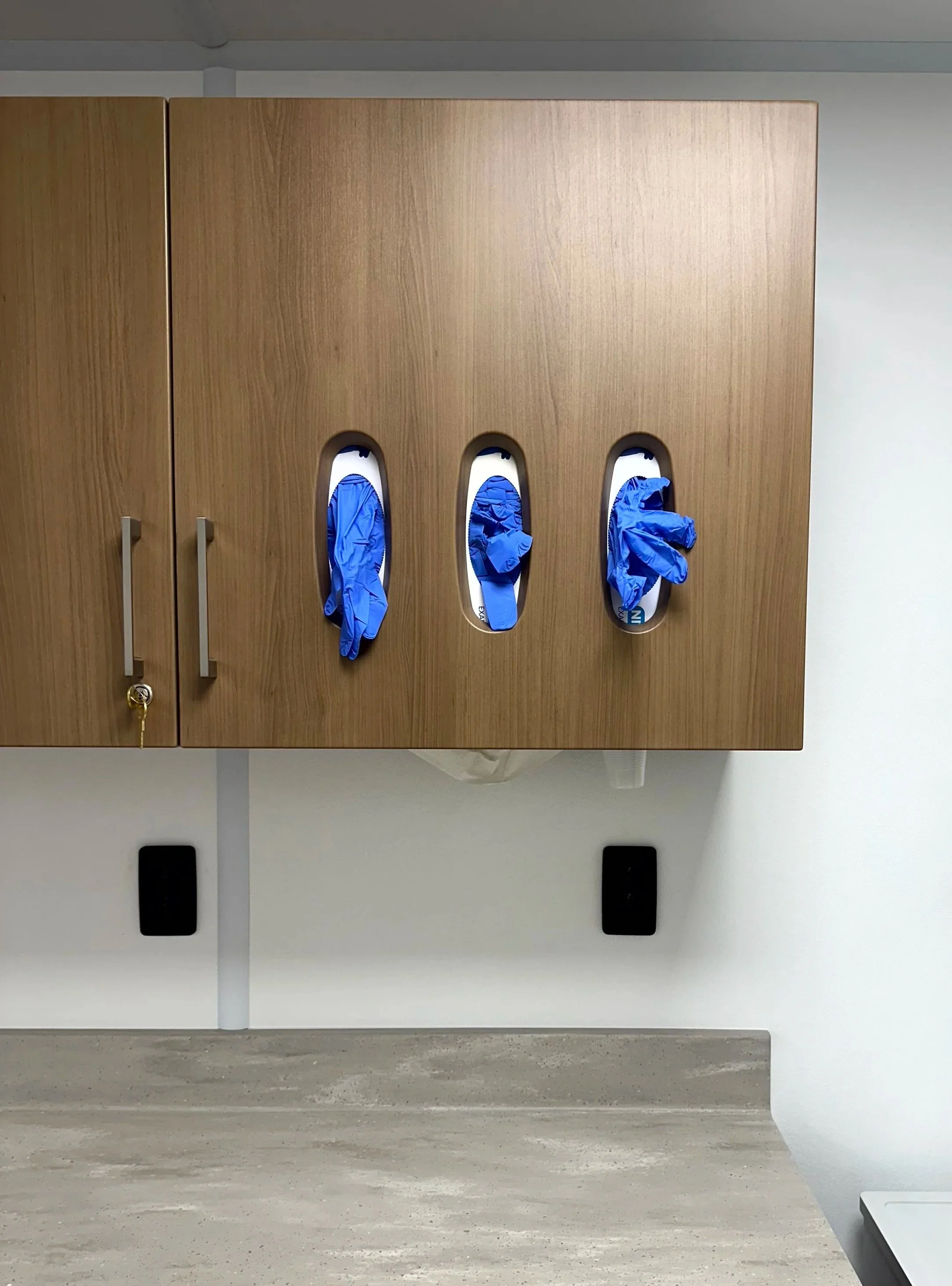 Midmark steel powder coated medical cabinetry with Corian countertops, integrated locks and soft touch close
